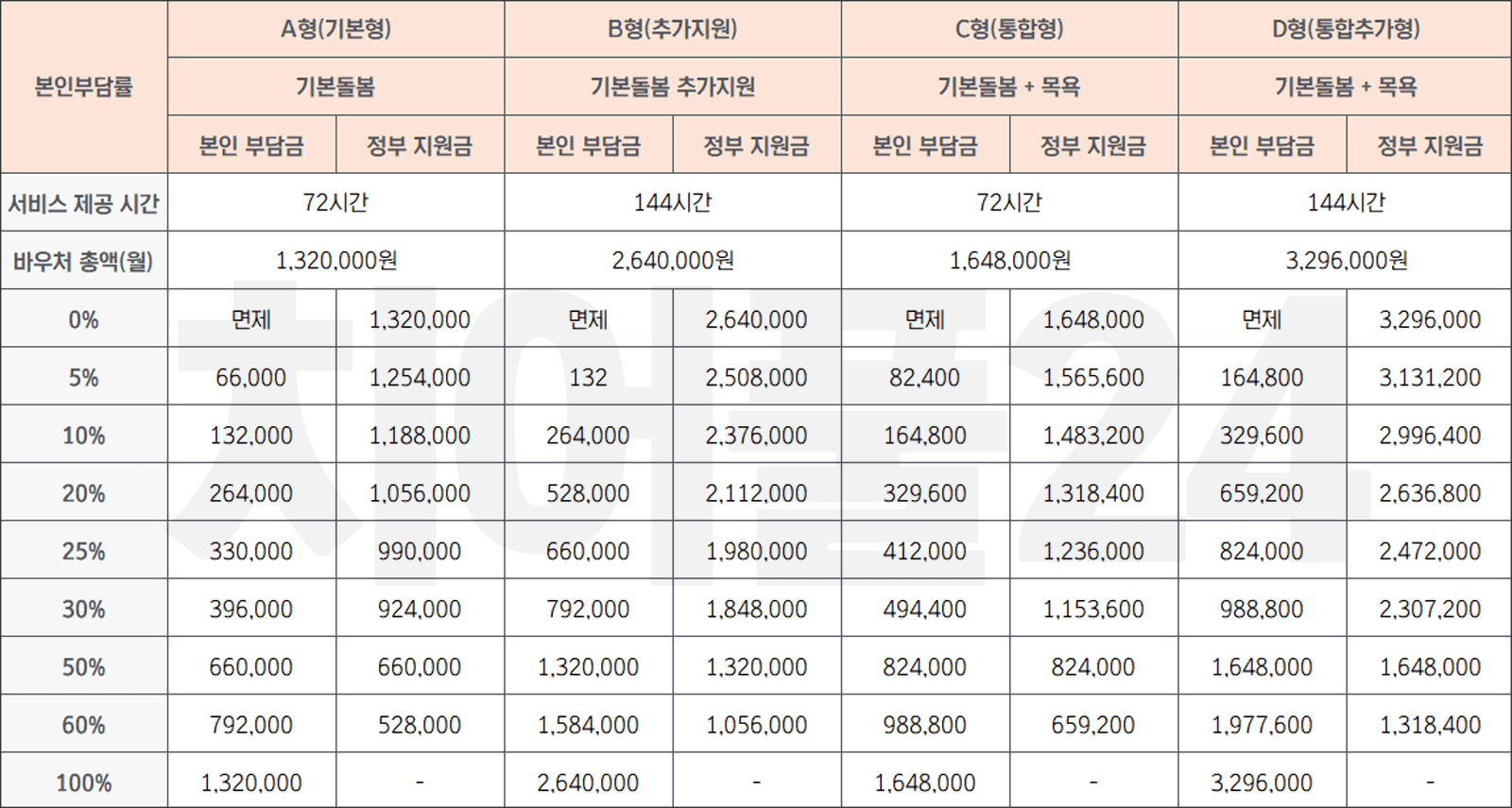 🔹D형(통합추가형) : 장기간 돌봄과 목욕이 모두 필요한 경우, 가장 많은 시간 지원