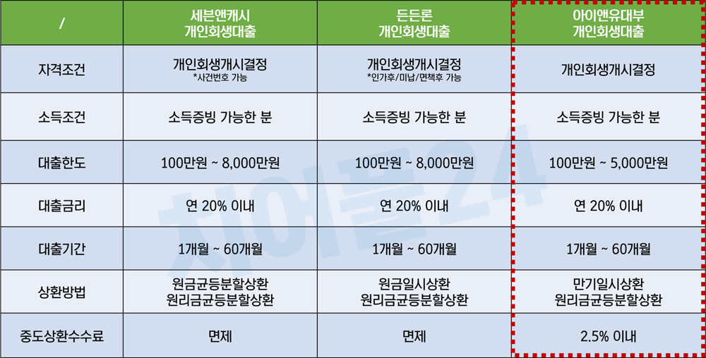 3금융권 개인회생대출 중 선호도가 높은 세븐앤캐시, 든든론과 비교해 보겠습니다. 아이앤유대부는 타사에 비해 전반적으로 조건이 좋지 않습니다. 개인회생개시결정자로 승인이 제한되어 있는 점, 낮은 한도, 중도상환수수료 부과 등이 단점입니다.