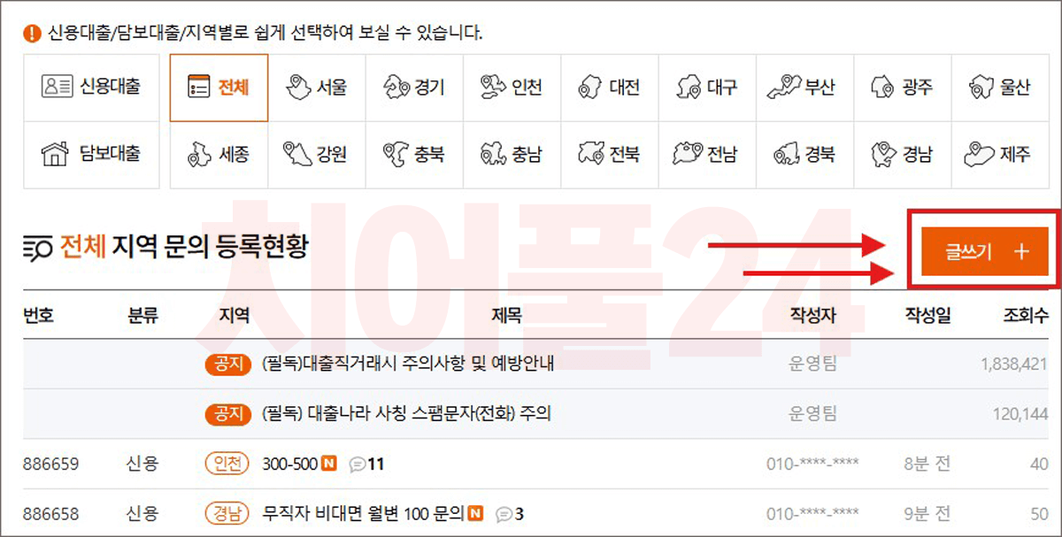 우측 ‘글쓰기’를 누른 후, 지역·직업·나이·성별 및 희망금액을 작성하면 됩니다. 전화번호는 인증절차에만 이용해야 합니다. 문의내용에 노출할 경우 자칫 피해를 입을 수 있습니다. 제목 및 내용 예시는 다음과 같습니다.